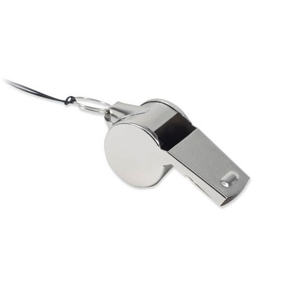Metalna zviždaljka pričvršćena na uzicu s sigurnosnom kopčom.