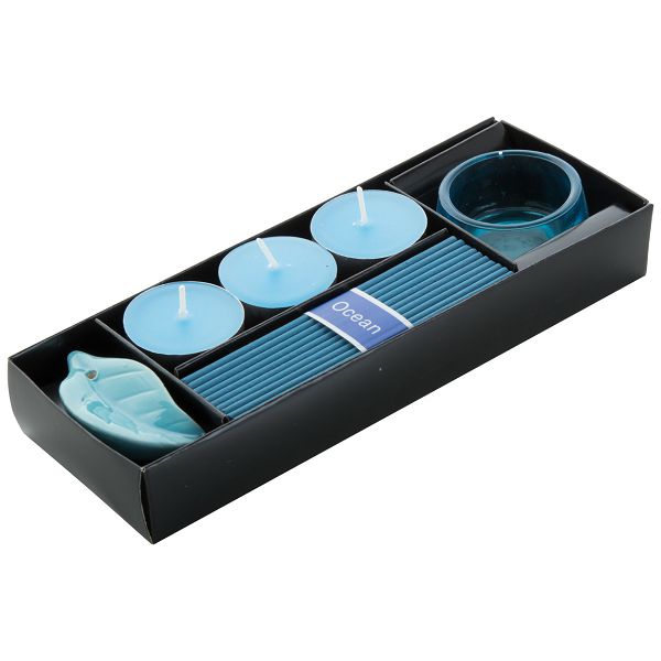 Incense set in black paper box with 10 pcs incense sticks, ceramic incense holder, 3 tea lights and candle holder.Veličina proizvoda: