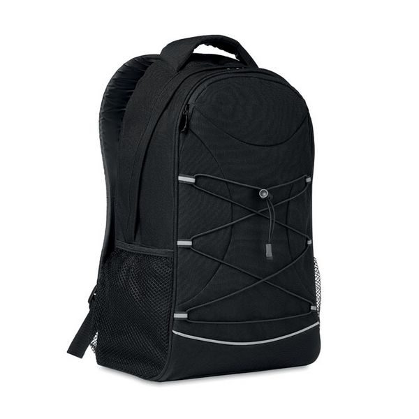 Ruksak od 600D RPET-a s tamnim uzicama sprijeda i reflektirajućim prednjim dijelom. Mrežasti džepovi s obje strane.