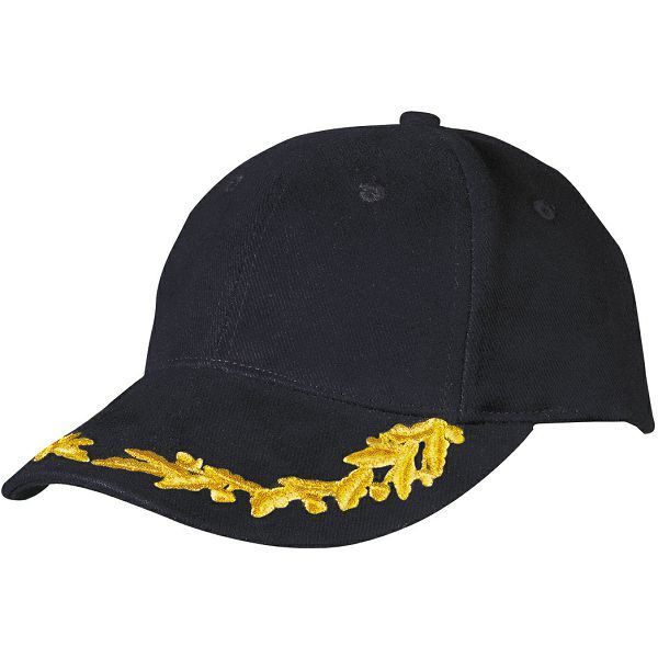 Ekstravagantna kapa s vezom od hrastovog lišća u lureksu na vrhu, metalna kopča s pritiskačem i izvezenom ušicom, podstavljena traka za znojenje od satena, laminirane prednje stranice, 6 izvezenih otvora za ventilaciju