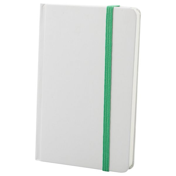 White carton covered notebook with 80 blank sheets and coloured rubber strap.Veličina proizvoda: