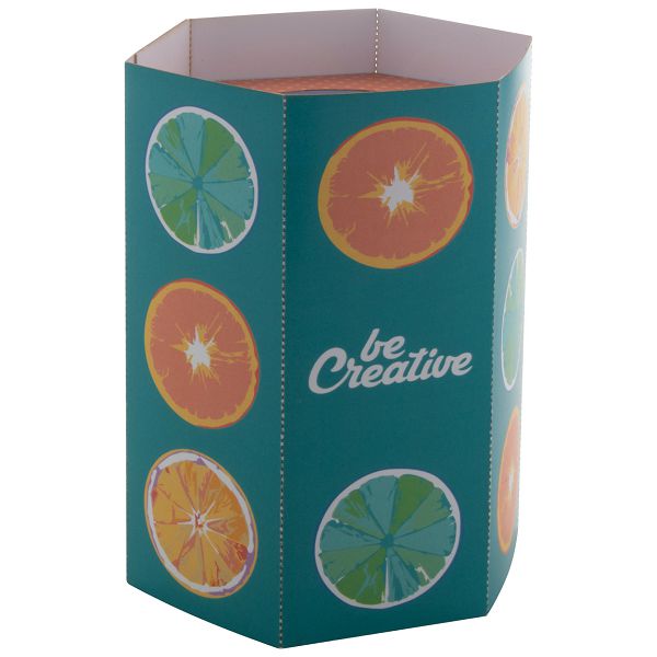 Custom made, hexagon shaped paper pen holder. Price includes full colour printing. MOQ: 100 pcs. Delivered flat-packed.