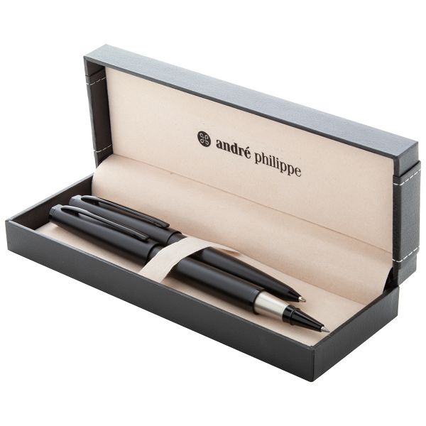 Elegant, metal ballpoint and roller pen set with matte black finish. In special paper gift box, with blue refill. André Philippe brand product.Veličina proizvoda:
