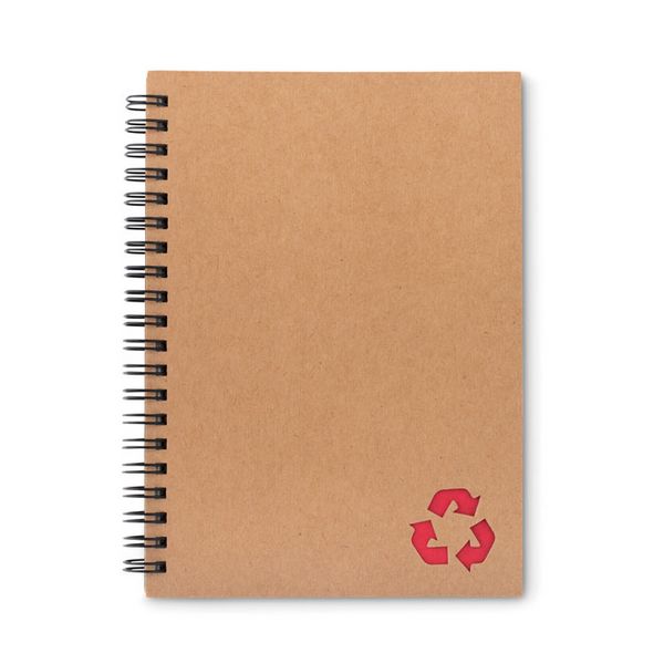 Bilježnica s recikliranim kartonskim koricama. Dvostruka žica. 140 stranica s linijama od mineralnog papira (70 listova). Mineralni papir izrađen je od kalcijevog karbonata i HDPE-a (polietilenske smole) koji se koristi kao vezivo. Vodootporan je i otporan na masnoću.