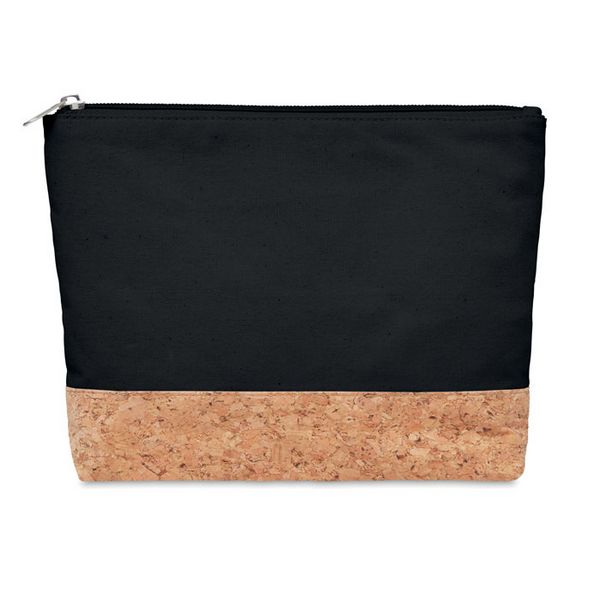 Kozmetička torba od pamuka s detaljem od pluta na dnu. 220 gr/m². Pluta je prirodni materijal, zbog svoje strukturne prirode i površinske poroznosti konačni rezultat tiska po artiklu može imati odstupanja.