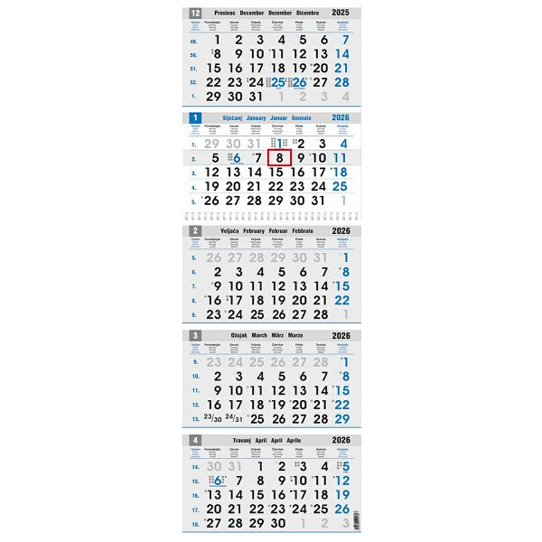 Opis proizvoda:12 listova x 2\ndimenzija: 27,5 x 102 cm\nprostor za dotisak: 27,5 x 20 cm\nopis: 5-mjesecni kalendarij s oznacenim blagdanima 15 država EU, pokazivac na traci, vrecica\njezici: HR, GB, DE, IT oznaceni blagdani u EU\nvrsta papira: bezdrvni 80g/m2 listovi, 400 g/m2 zaglavlje\nuvez: spiralni x 2\npakiranje: 25 kom