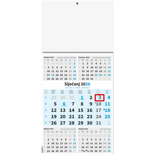 Poslovni trodjelni kalendar PLAVI 2026 – 5 mj., 12 listova