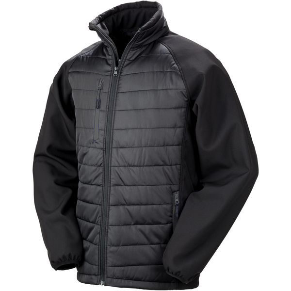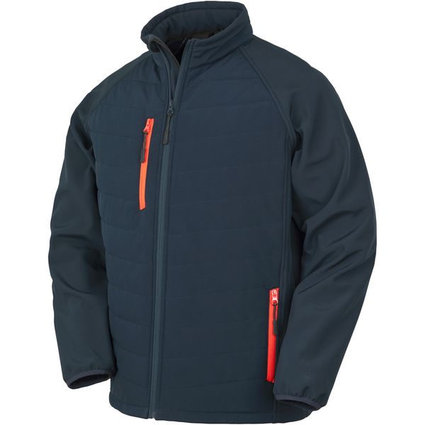 Vodootporan, podstavljeni uspravni ovratnik, softshell rukavi s mogućnošću ispisa, rubne manžete, YKK patentni zatvarač sa štitnikom za bradu, kontrastni detalji na prsima i bočnim džepovima, ukrasni pristup na lijevoj strani prsa, petlja za vješanje, mješavina materijala od prošivenog podstavljenog poliestera i softshell materijala Materijal: