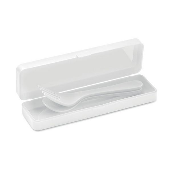 Prijenosni set pribora za jelo od polipropilena za višekratnu upotrebu i kutija. Uključuje žlicu, vilicu i nož.