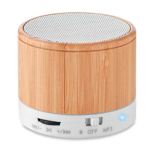 Bežični 4.2 zvučnik od ABS-a s kućištem od bambusa i LED svjetlosnom indikacijom. Uključena je 1 punjiva litijeva baterija od 450 mAh. Uključuje priključak za SD karticu i AUX/USB kabel. Funkcija handsfree poziva. Izlazni podaci: 3 W, 3 Ohma i 5 V. Vrijeme reprodukcije približno 3 sata. Bambus je prirodni proizvod, moguće su male varijacije u boji i veličini po artiklu, što može utjecati na konačni rezultat ukrašavanja.