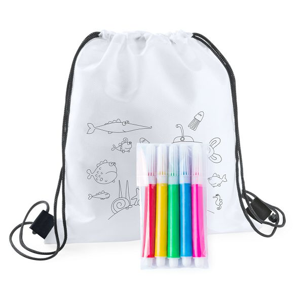Non-woven, colouring drawstring bag for children with 5 markers.
