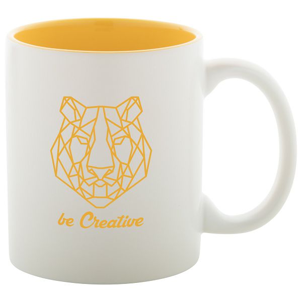 White ceramic mug with coloured inside, 350 ml. With special coating for engraving, the engraved logo is matching the inside colour. In gift box.Veličina proizvoda: