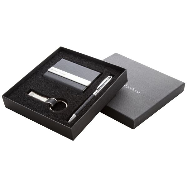 Metal and PU leather set with ballpoint pen, business card holder and keyring. In black gift box. André Philippe brand product.Veličina proizvoda: