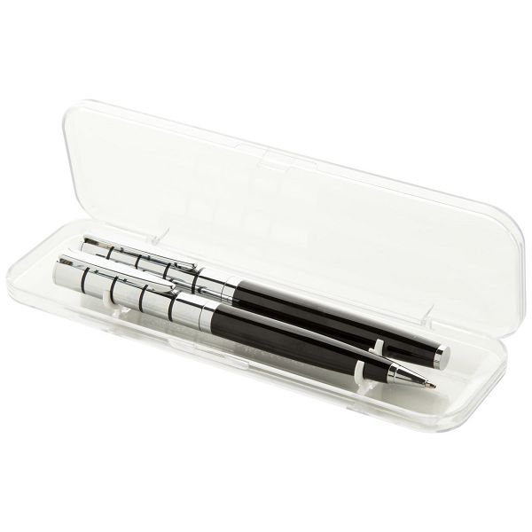 Metal ballpoint and roller pen set with shiny chrome parts. In transparent plastic case, with blue refill.Veličina proizvoda: