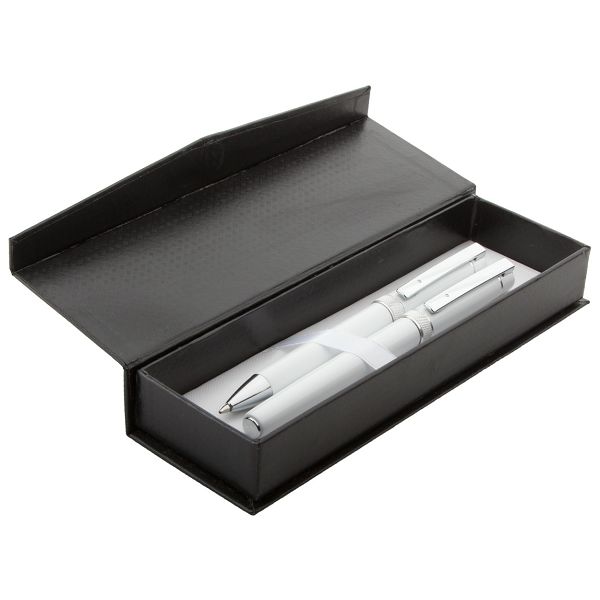 Aluminium pen set with ballpoint pen and roller pen, with shiny barrel and milled aluminium decoration. In black gift box with blue refill.Veličina proizvoda: