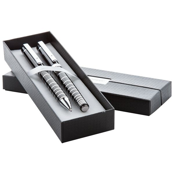 Elegant, aluminium pen set with ballpoint pen and roller pen. With shiny barrel and chrome rings. In black gift box with blue refill. André Philippe brand product.Veličina proizvoda: