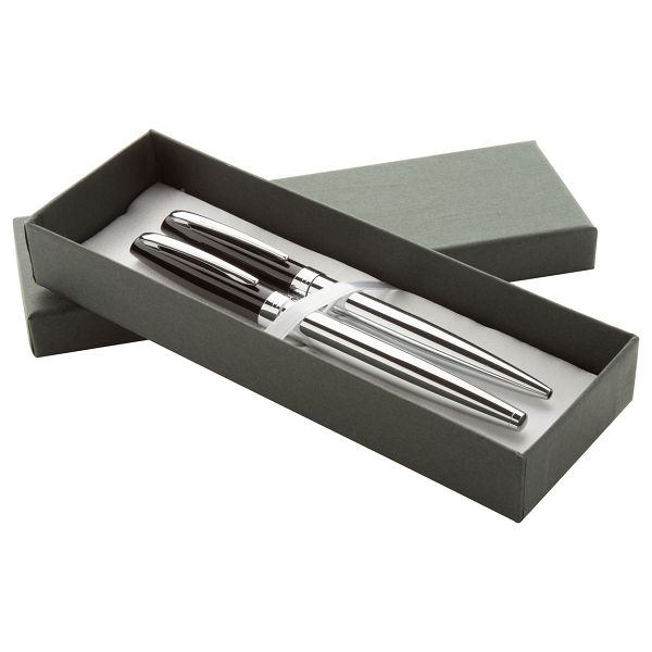 Metal ballpoint pen and roller pen with black lacquered cap and shiny chrome barrel and clip. In gift box, with blue refill.Veličina proizvoda: