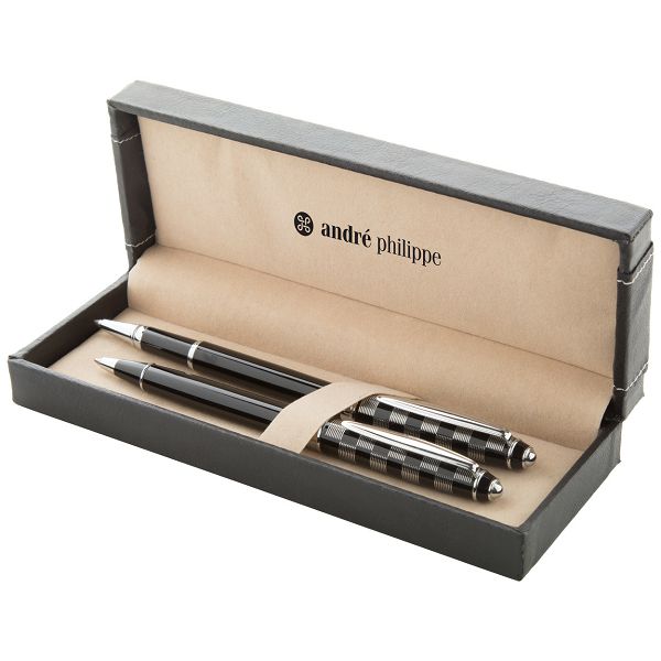 Elegant, metal ballpoint and roller pen set with shiny chrome parts. In PU leather gift box, with blue refill. André Philippe brand product.Veličina proizvoda: