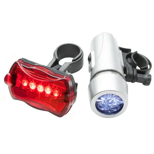 Plastic bicycle light set with handlebar and seatpost mounts. With 5 LED front light and 5 LED rear blinker. Operates with 6 AAA batteries, delivered without batteries. Not merchadised in the following countries: DE, AT, CH.Veličina proizvoda: