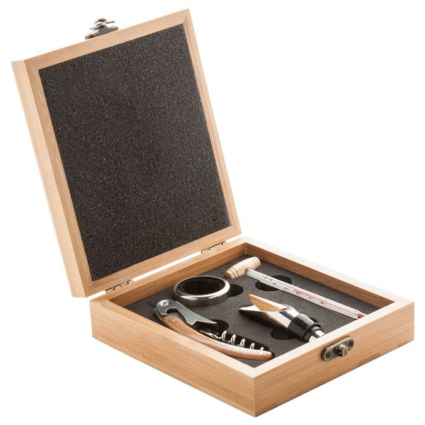 Wine set in bamboo box with 4 wooden inlaid wine accessories.