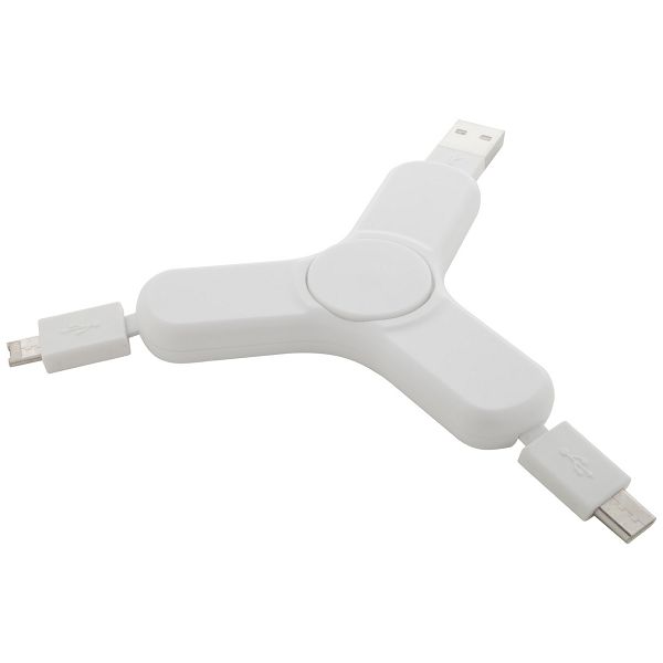 Plastic fidget spinner USB charger cable with micro USB, USB-C and Lightning connectors.