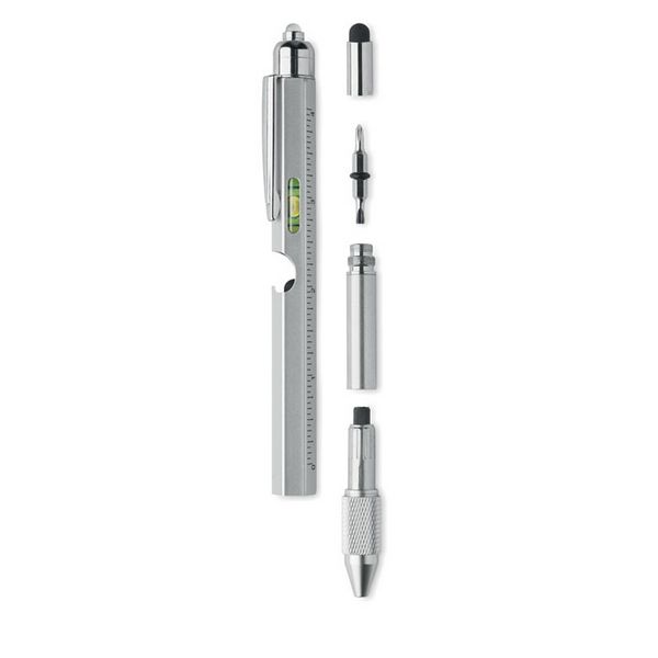Libela s okretnim mehanizmom od nehrđajućeg čelika s ravnalom, olovkom te križnim i ravnim nastavcima odvijača i LED diodom. Uključene 3 AG baterije. Plava tinta.