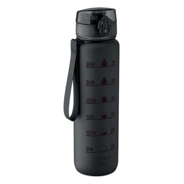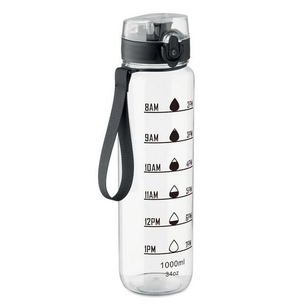 Sportska boca za vodu od RPET-a, motivacijske oznake vremena, poklopac na preklop koji se otvara jednom rukom, sigurnosna brava i remen za nošenje. Ne propušta. Kapacitet: 1 l.