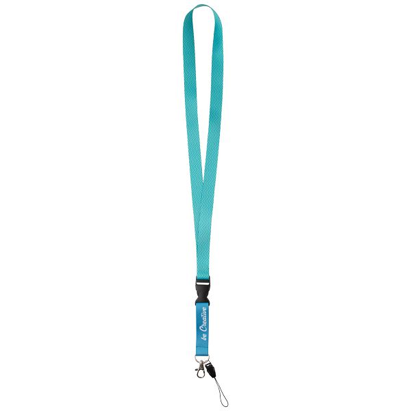 Custom made, polyester lanyard with detachable metal carabiner and mobile string. With sublimation printed graphics on both sides. MOQ: 100 pcs.Veličina proizvoda: