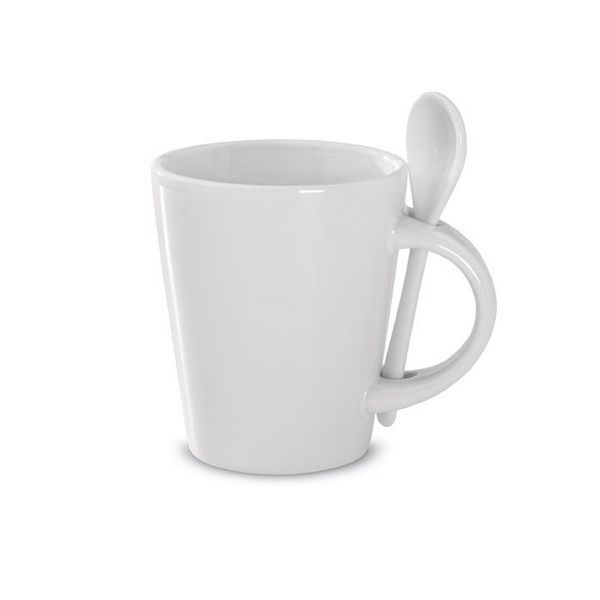 Kameninska šalica kapaciteta 300 ml sa posebnim premazom za sublimacijski tisak. Ima žličicu na dršci. Pojedinačno pakiranje u bijeloj kartonskoj kutiji.