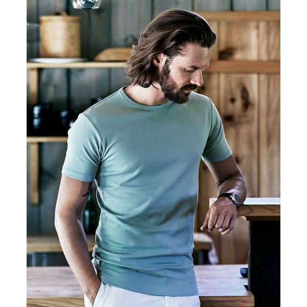 Kroj po mjeri, okrugli dekolte s uskim rubovima, dvostruki šavovi, visokokvalitetni interlock od pamuka s dugim vlaknima, rastezljiv, ispran silikonom za vrlo gladak dodir, periv na 60°