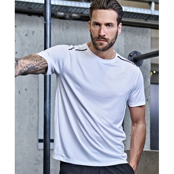 Prozračna, dvostruko prošivena, prednji rameni šav s crnim prugama, mekana tkanina, upija znoj, brzo se sušiMaterijal: