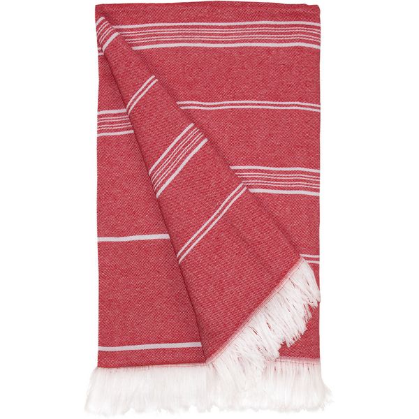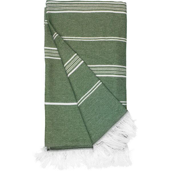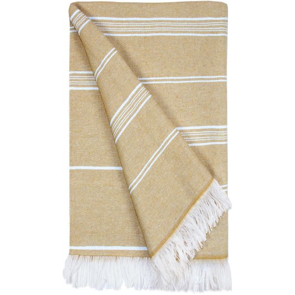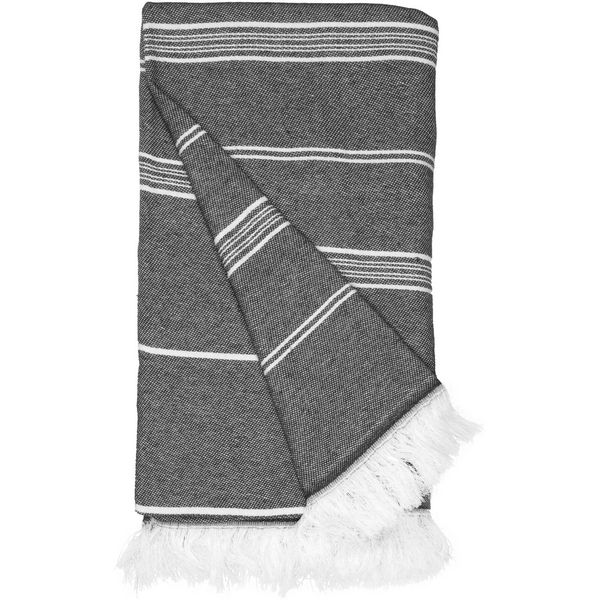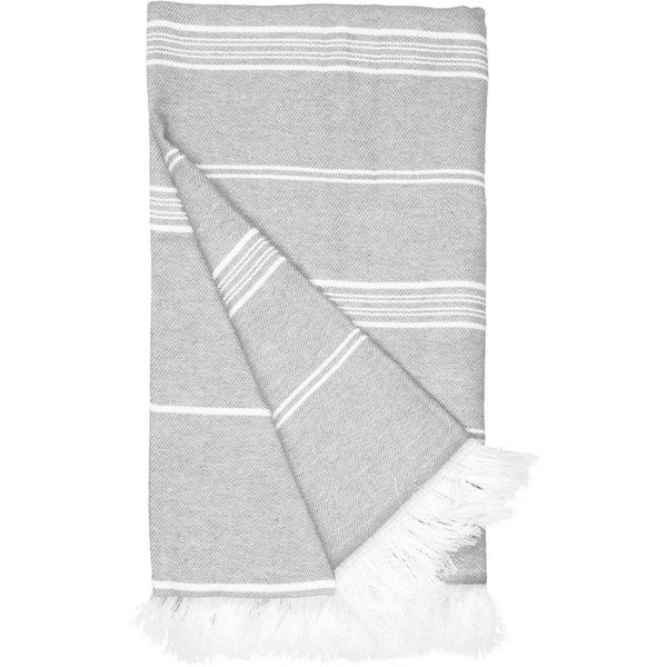 Prugasti dizajn, upletene rese, lagan i brzo se suši, veličina: 100x180 cm, periva na 30°, dolazi smotana s užetom od recikliranog pamuka