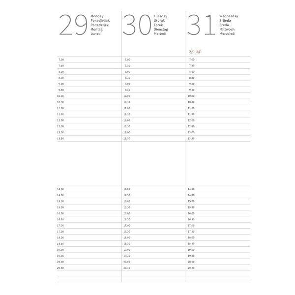 Sadržaj\nPrvi dio sadrži osnovne podatke, kalendar za tekucu i sljedecu godinu,\npopis praznika država clanica EU, godišnji planer za tekucu godinu.\nDrugi dio sadrži planer po tjednima na 106 stranica.\nTreci dio sadrži godišnji planer za sljedecu godinu.\nCetvrti dio je prostor za bilješke na 96 stranica.\nUvez: šivani, tvrdi uvez, pokazna vrpca, termolabilna eko koža (PU platno)\nPreporucena vrsta TISKA: sitotisak, foliotisak, termotisak i UV tisak.\nLIMITED EDITION DONAT ROKOVNIKA - BLOKOVI IMAJU OBOJANIRUB, DODANU GODINU NA BLOKU ROKOVNIKA ( PRINT EDGE )