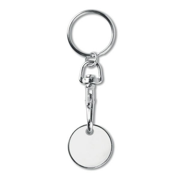 Metalni privjesak za ključeve za kolica s euro žetonom. S imitacijom emajla na prednjoj strani. Dimenzije Ø23,2x2,1 mm debljine.