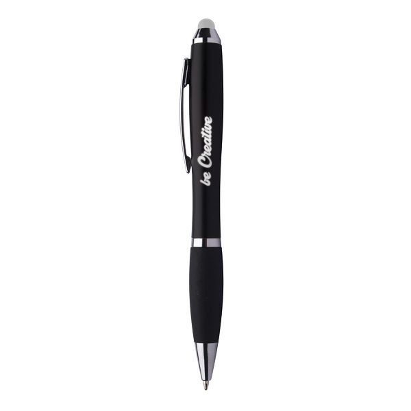 Plastic ballpoint and touch screen pen in black colour with rubber grip, coloured stylus and matching colour LED light for illuminated engraving. Light can be activated by pressing the button on the body of the pen. With button cell battery and blue refill.Veličina proizvoda: