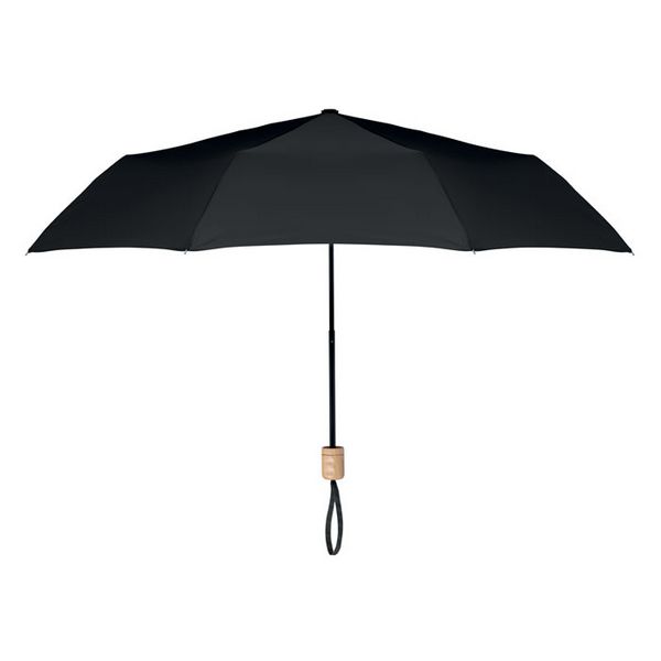 Sklopivi kišobran od 21 inča, 3 dijela s 190T RPET tkaninom od svilene repice, crnim okvirom i rebrima s drvenom ručkom. Ručno otvaranje i zatvaranje. Torbica od istog materijala.