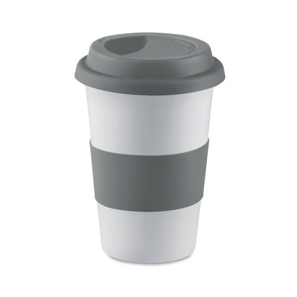 Keramička šalica s jednom stijenkom, silikonskim poklopcem i trakom za omotavanje. Kapacitet 400 ml. Keramička preljevna ploča može se prati u perilici posuđa. Budući da je ovo šalica s jednom stijenkom, ipak može doći do prijenosa topline.