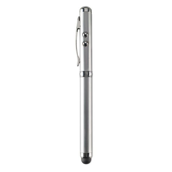 Metalni laserski pokazivač. Bijelo LED svjetlo, crveni laserski pokazivač i mekani vrh. Uključuje 3 gumbaste baterije. Isporučuje se u metalnoj limenoj kutiji.