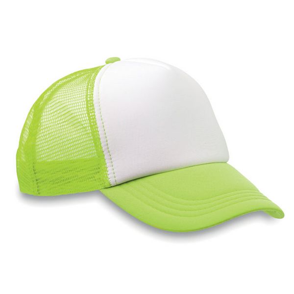 5-dijelna kapa za kamionete od poliestera 140-150 gr/m2 s plastičnim kopčanjem na druker. Bijeli prednji dio i vizir u boji od poliesterskog žerseja s pjenastom podlogom. Ostali dijelovi u mrežastoj tkanini u boji. Veličina 7 1/4.