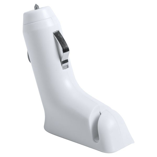 Plastic USB car charger with 2 ports, max output 3000 mA. With built-in emergency hammer and seatbelt cutter.Veličina proizvoda: