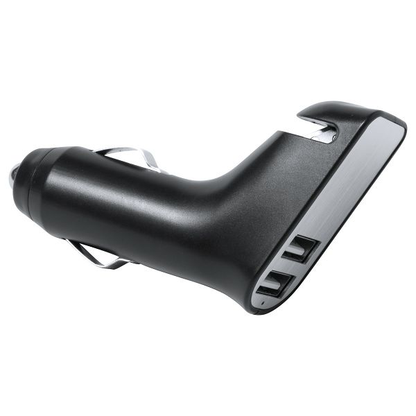 Plastic USB car charger with 2 ports, max output 3000 mA. With built-in emergency hammer and seatbelt cutter.