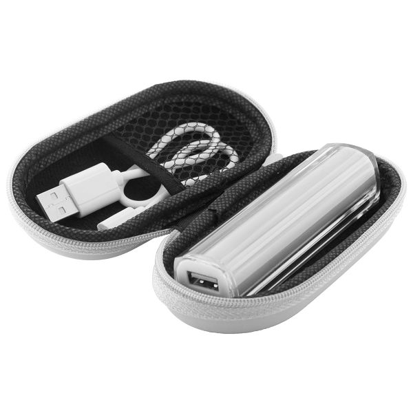 Plastic USB power bank with 2200 mAh battery. In zipped case with micro USB charger cable.