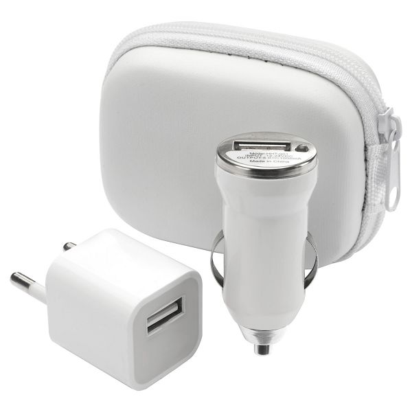 USB charger set in zipped case, including: car and AC USB chargers. Max output: 1000 mA.
