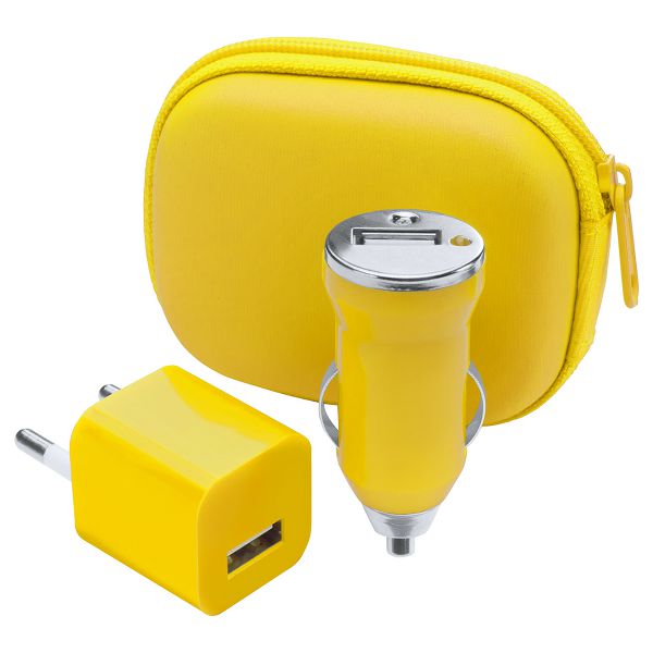 USB charger set in zipped case, including: car and AC USB chargers. Max output: 1000 mA.