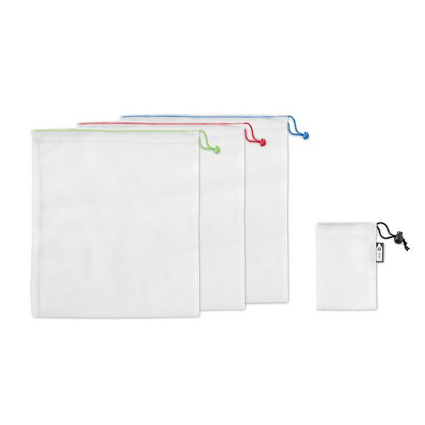 Set od 3 RPET mrežaste vrećice u RPET vrećici. Vrećice za voće ili povrće za višekratnu upotrebu kao alternativa plastičnim vrećicama. Zatvaranje s vezicom. Može se prati u perilici rublja, bez BPA i sigurno za hranu.