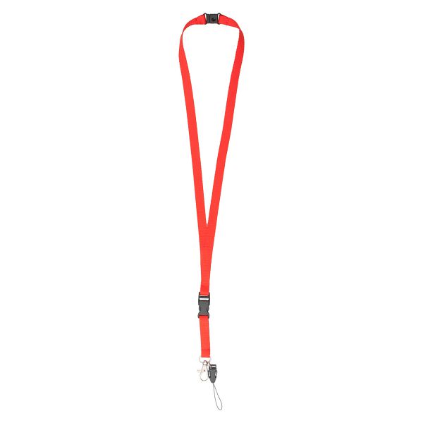 Lanyard with safety fastener, detachable metal carabiner and mobile string. Material: polyester.Veličina proizvoda: