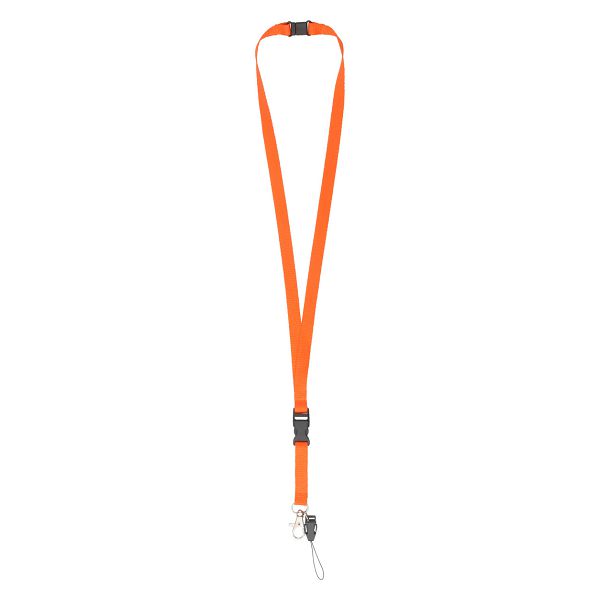 Lanyard with safety fastener, detachable metal carabiner and mobile string. Material: polyester.Veličina proizvoda:
