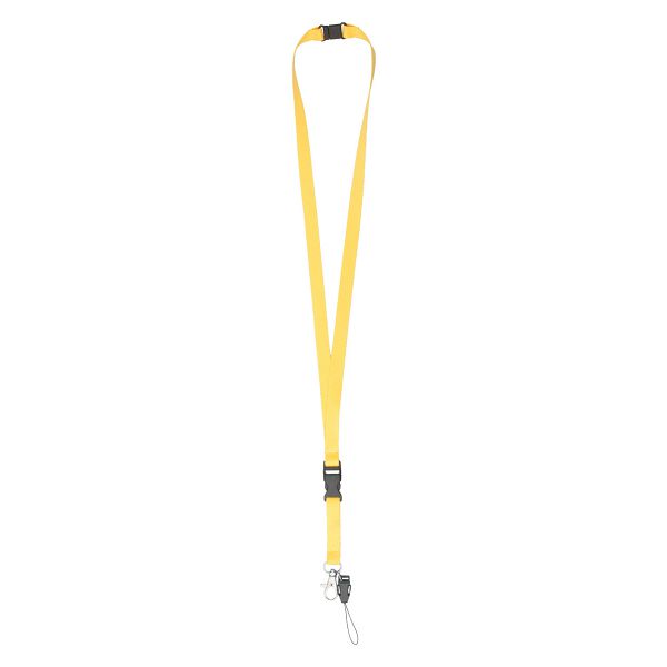 Lanyard with safety fastener, detachable metal carabiner and mobile string. Material: polyester.Veličina proizvoda: