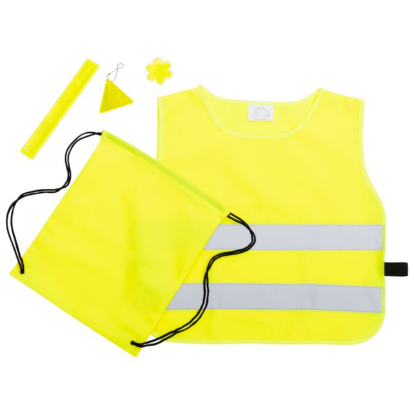 5 pcs visibility set for kids. Including: vest (EN1150 compliant), reflective band, drawstring bag, sticker, safety reflector. 100 % polyester.
