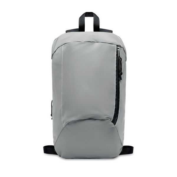 Ruksak s prednjim dijelom od visoko reflektirajućeg poliestera s vanjskim džepom na patentni zatvarač i za udobnost podstavljenim stražnjim dijelom od 600D poliestera.